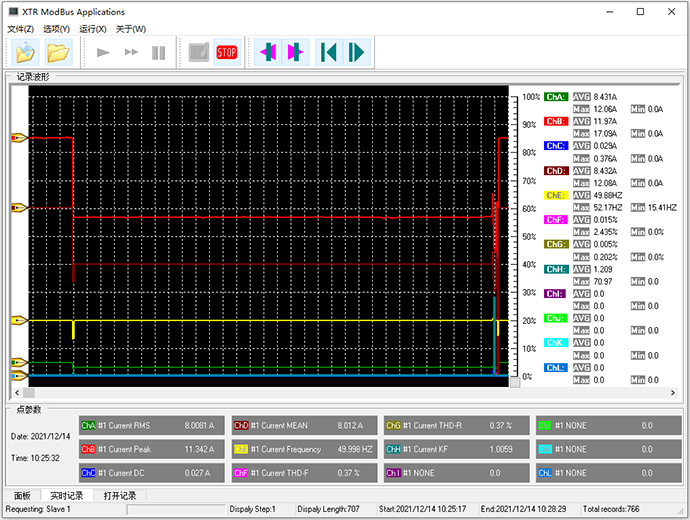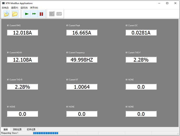 PTR系列功率变送器标配的记录软件,可以通过RS-485通讯接口,采用Modbus-RTU协议,联机读取多台仪器参数,实现测量参数趋势曲线记录。