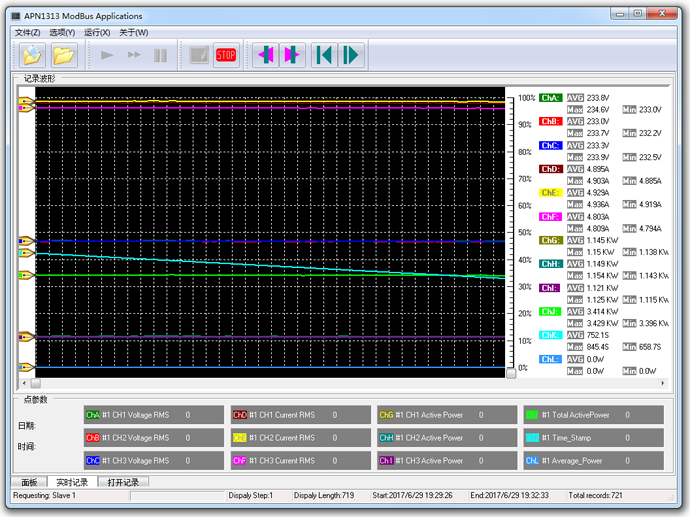 APN1513系列三相功率分析模块标配的记录软件,可以通过RS485通讯接口,采用Modbus-RTU协议,联机读取多台仪器参数,实现测量参数趋势曲线记录。