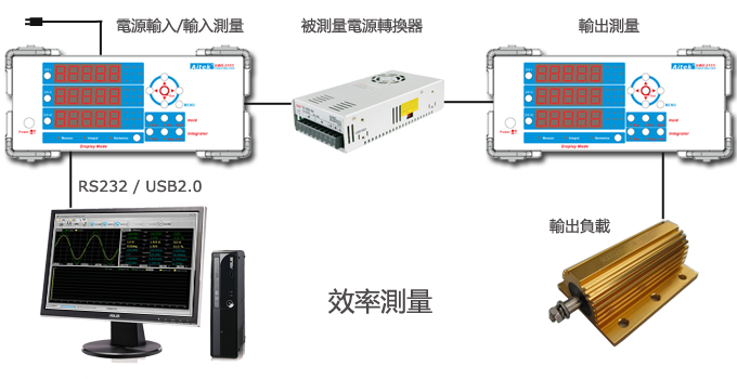 通过和AWE2111系列单相功率分析仪配合,AWE2111作为主机,AWE1611 PLUS作为从机,用RS485联机,还可以轻松测量一个电源转换器或变压器、逆变器的效率,最多支持单路输入六路输出的测量。